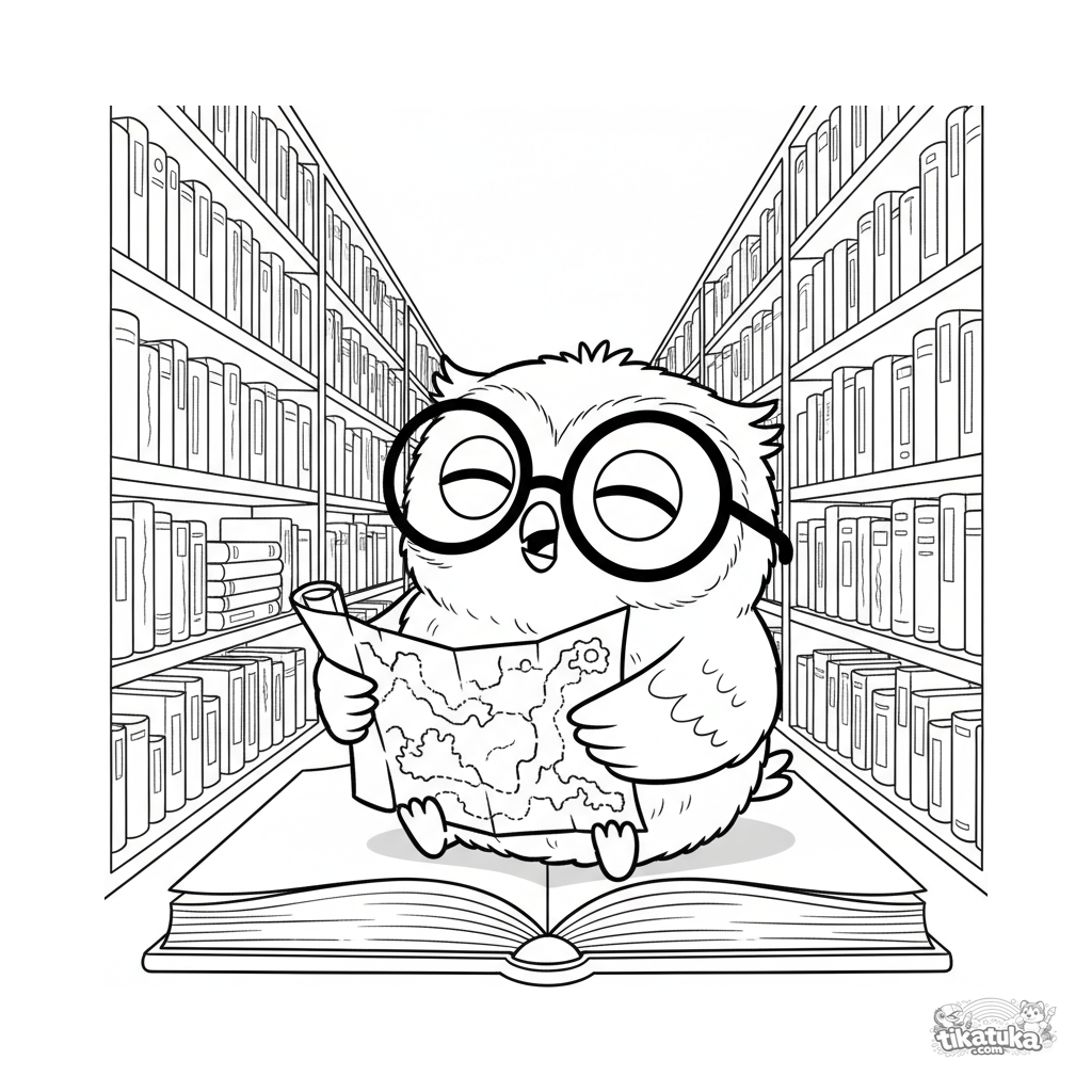 Un buhito, Oof, se sienta en un libro gigante, abrumado por una inmensa biblioteca. Descarga, imprime o colorea online esta tierna ilustración.