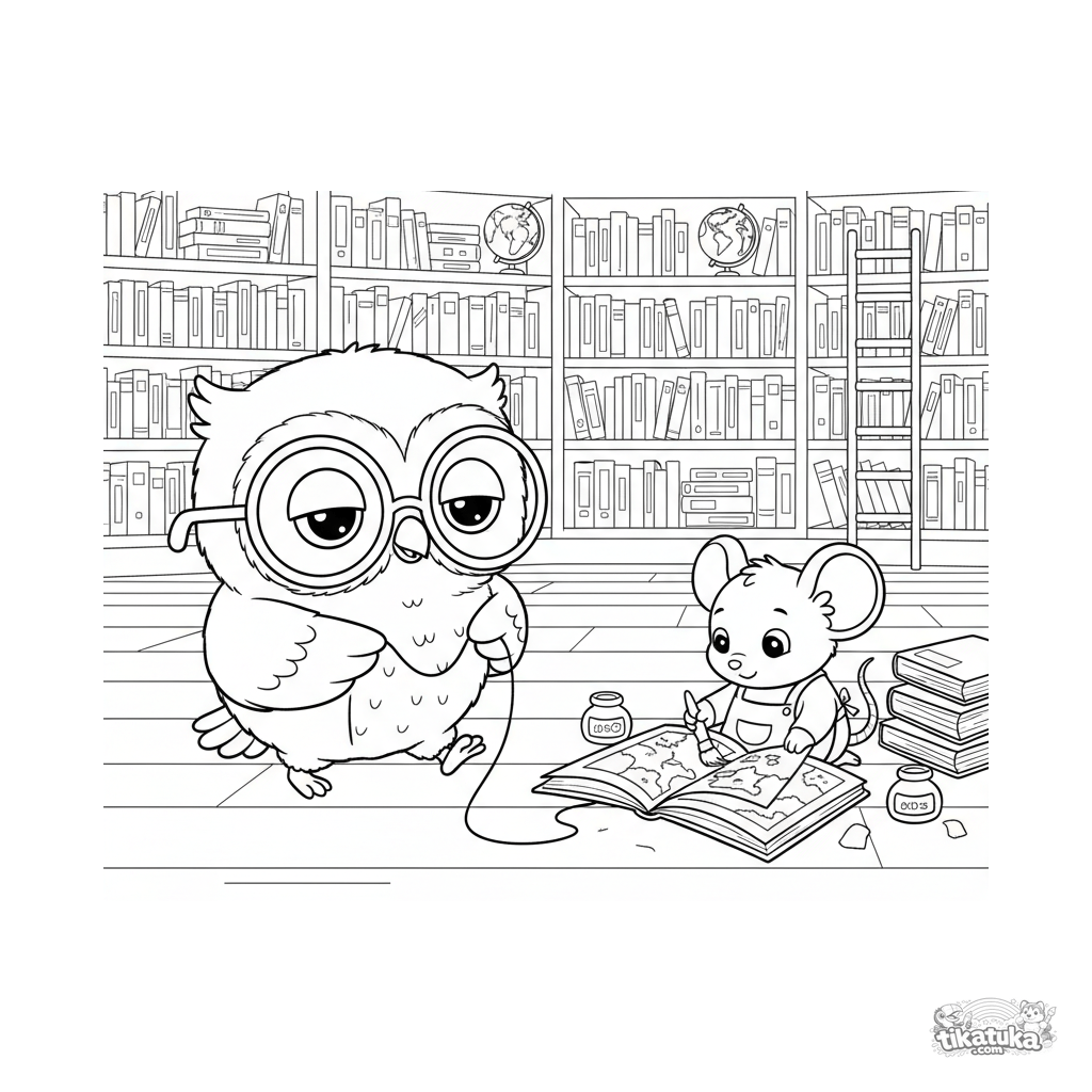 Oof, el buhito, sigue un hilo rojo en la biblioteca hasta un ratón que pega un atlas. ¡Descarga, imprime o colorea online!