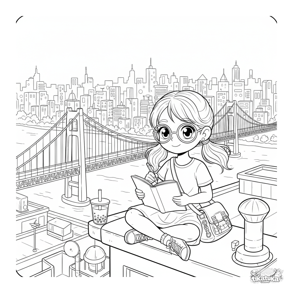 Página para colorear urbana anime detallada: una chica dibuja un puente desde una azotea al anochecer. Panorama de la ciudad, detalles de la azotea y un cuaderno de dibujo. Para niños de 10-12 años.