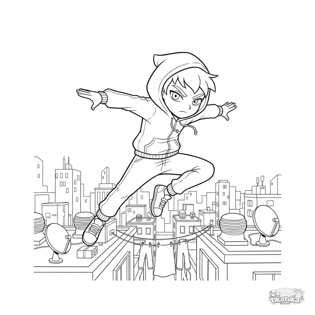 Página dinámica para colorear estilo manga de acción: un ninja moderno realiza un salto de parkour entre techos al atardecer. Para 10-12 años, con fondo urbano detallado de antenas y unidades de ventilación.