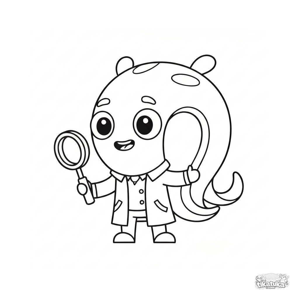 Página para colorear para niños. Bacteria vibrio detective con lupa y tentáculos en gabardina. Líneas simples para pequeños. Descarga gratis.