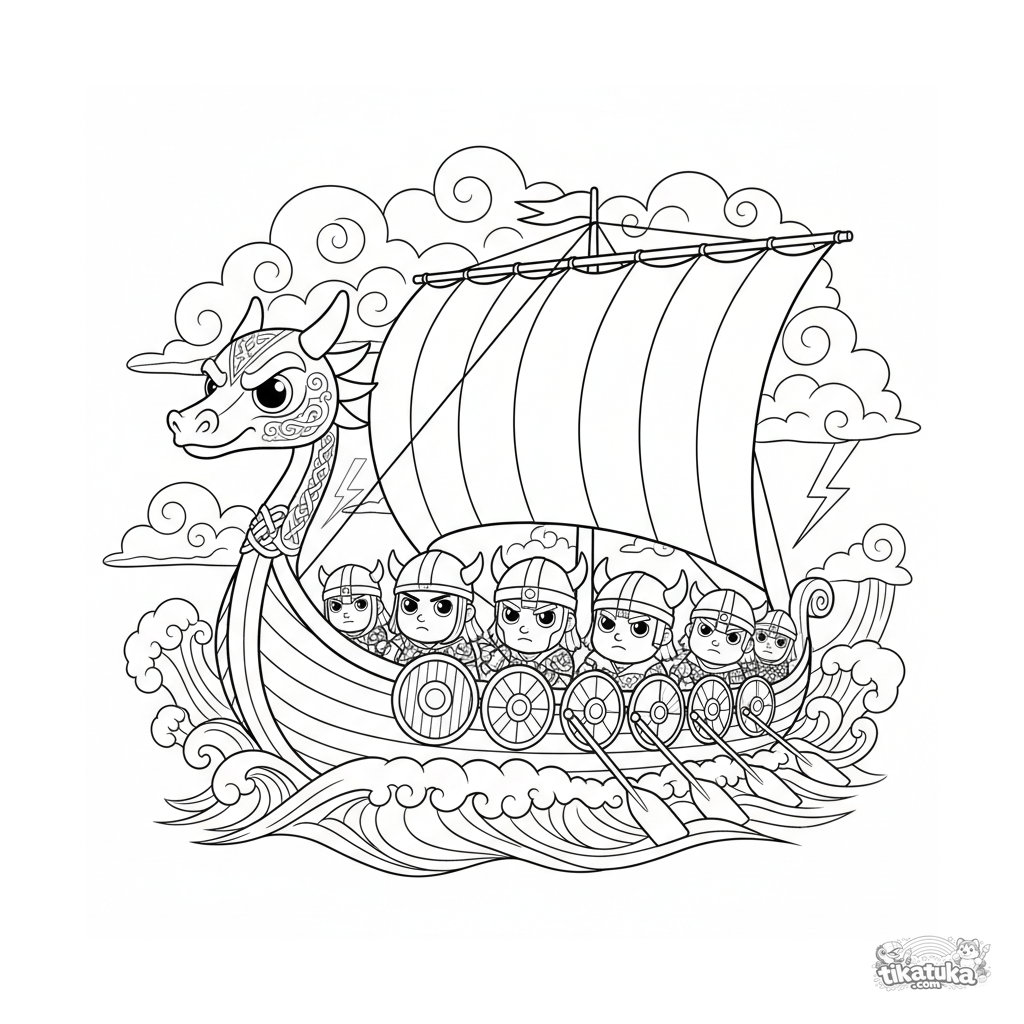 Página para colorear detallada para 10-12 años: un fiero barco vikingo con proa de dragón navega en un mar tormentoso. Guerreros reman, escudos en el costado, vela llena de viento.