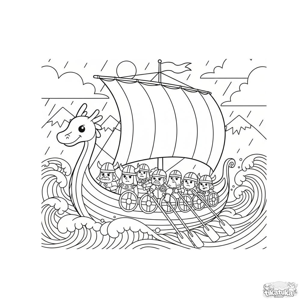 Página para colorear para niños de 4 a 6 años: un poderoso barco largo vikingo navegando por un fiordo tormentoso.