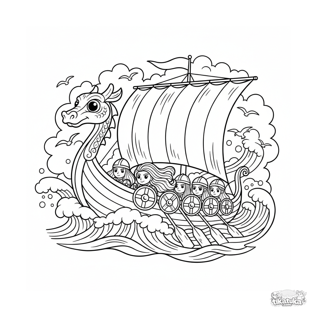 Página para colorear para preadolescentes de 7-9 años: un fiero barco vikingo navega por un mar tormentoso. Escena dinámica al estilo de dibujos animados de los 80.
