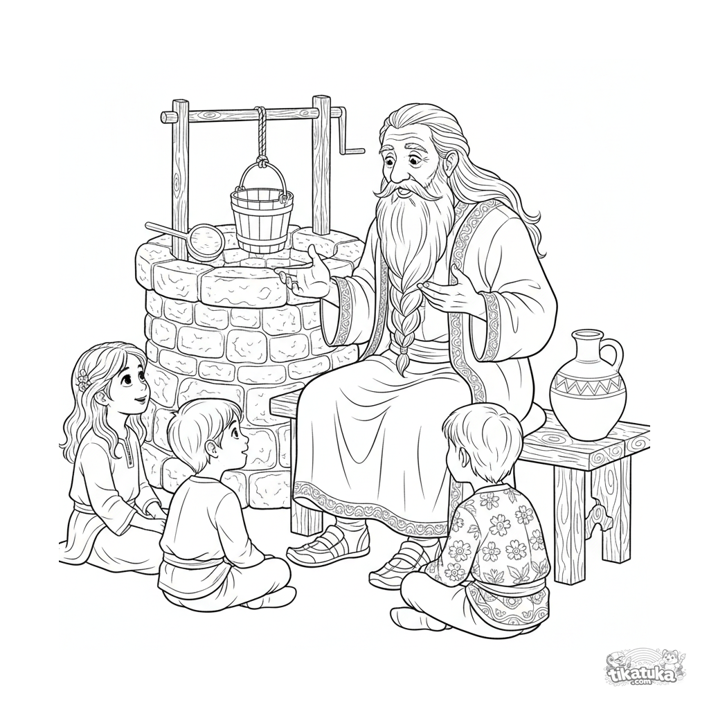 Página para colorear para niños de 10-12 años: un cuentacuentos del pueblo comparte un cuento en el pozo de agua viva. Escena detallada con niños, anciano en caftán y objetos domésticos.