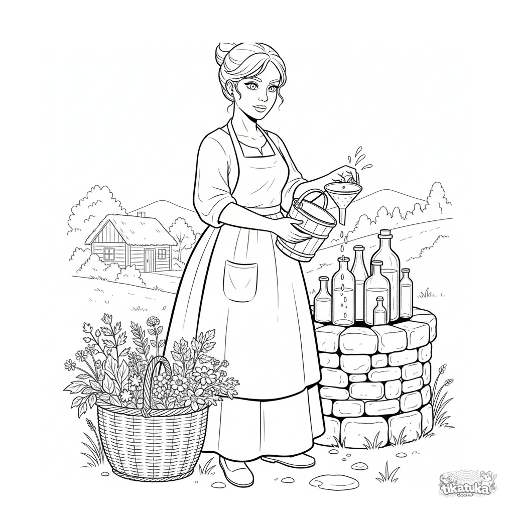Página para colorear para niños 7-9: una herbolaria aldeana recoge agua viva del pozo para sus remedios. Estilo de boceto acuarela, escena centrada.
