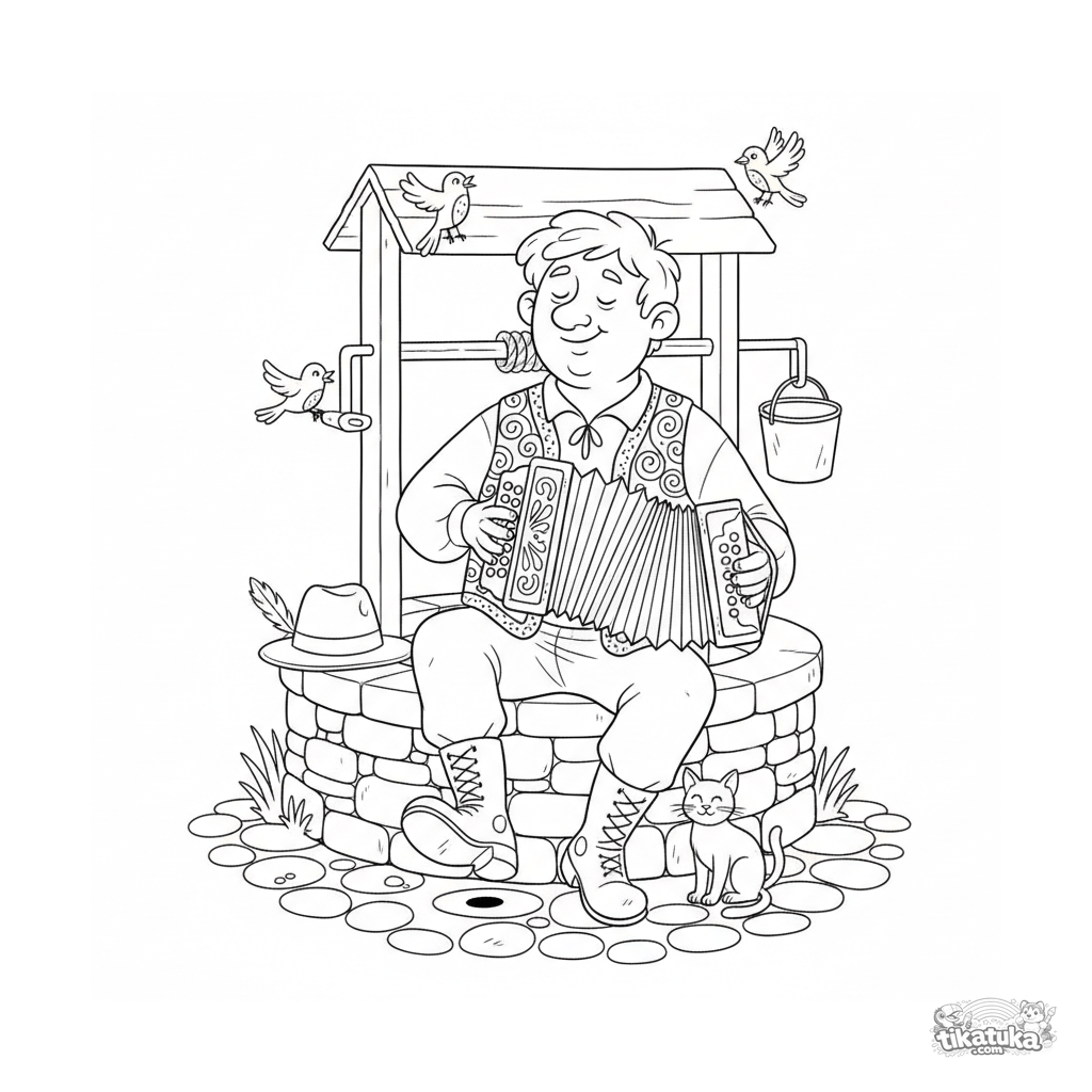 Página para colorear para 10-12 años: un músico del pueblo toca el acordeón junto al pozo. Ilustración detallada en estilo guía de campo, muchas texturas.
