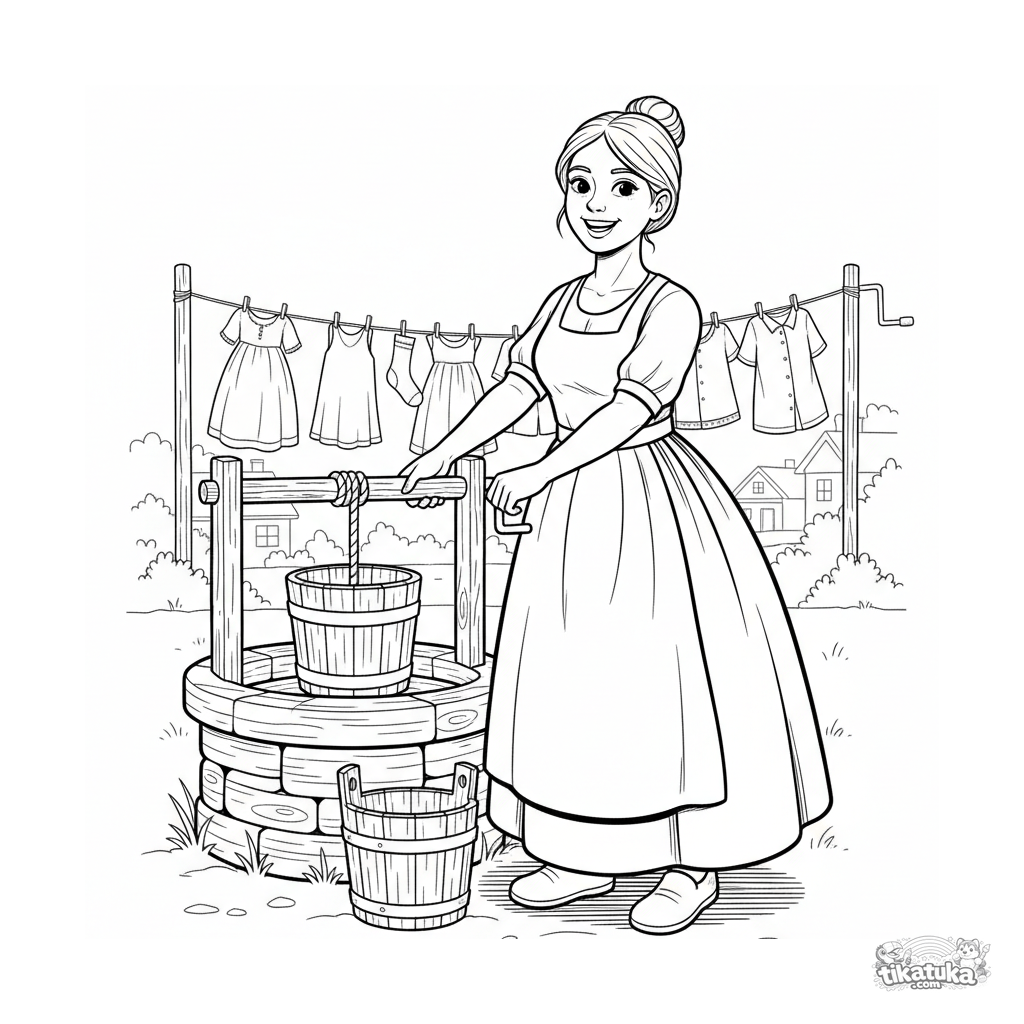 Página para colorear para niños 4-6: una mujer del pueblo sacando agua de un pozo. Estilo grabado en linóleo, formas contrastantes atrevidas, vida folclórica cotidiana.