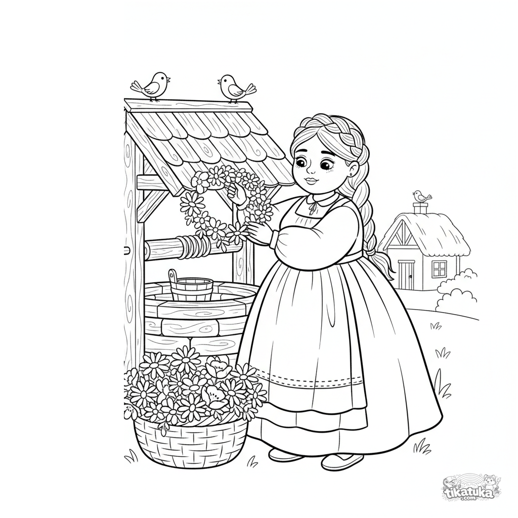 Página para colorear para preadolescentes 7-9: una mujer decora el pozo con flores como ofrenda de agradecimiento. Estilo bordado folclórico con patrones geométricos en la ropa.