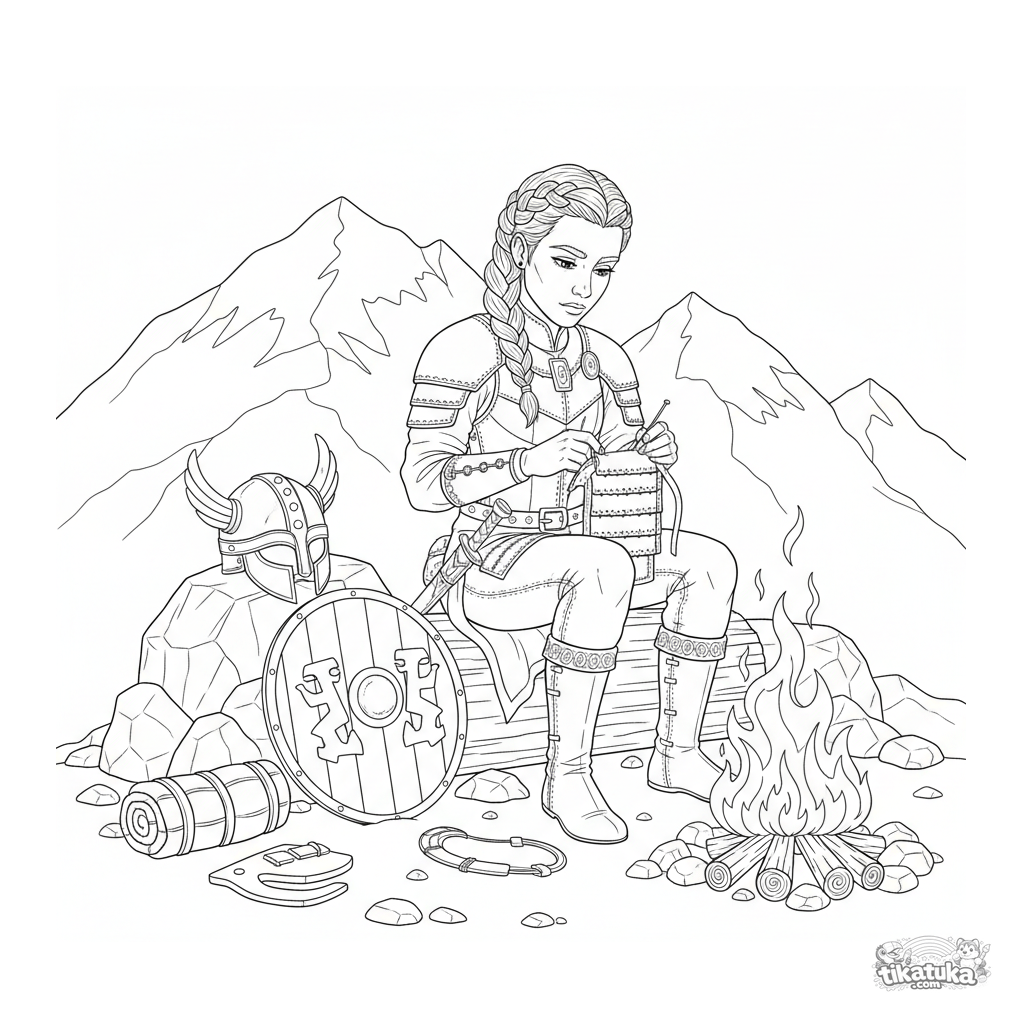 Página para colorear para niños mayores 10-12: una princesa guerrera remienda su armadura junto a una fogata en un campamento base de montaña. Escena realista detallada.