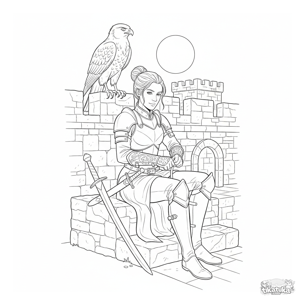 Página para colorear detallada para niños de 10 a 12 años: una princesa guerrera a la luz de la luna arregla su armadura en las almenas del castillo.