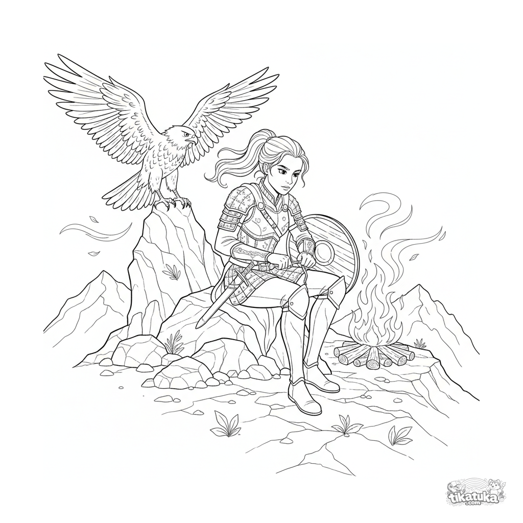Página para colorear para mayores 10-12: una princesa guerrera arregla su escudo junto a una hoguera en una cima montañosa. Escena detallada con un halcón.