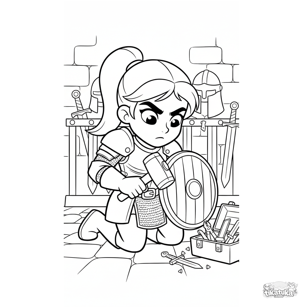 Página para colorear para 7-9 años: una princesa guerrera en armadura repara su escudo en una armería de castillo. Escena de acción con herramientas y armas.