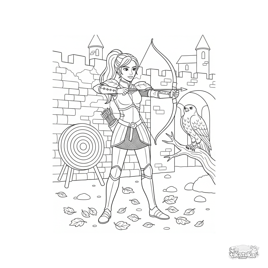 Página para colorear para preadolescentes 7-9: una princesa guerrera practica tiro con arco en un patio otoñal. Contornos limpios.