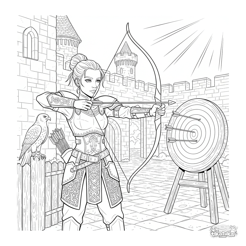 Página para colorear detallada para niños 10-12: una princesa guerrera con armadura apunta con un arco a un blanco de paja en el patio de un castillo.