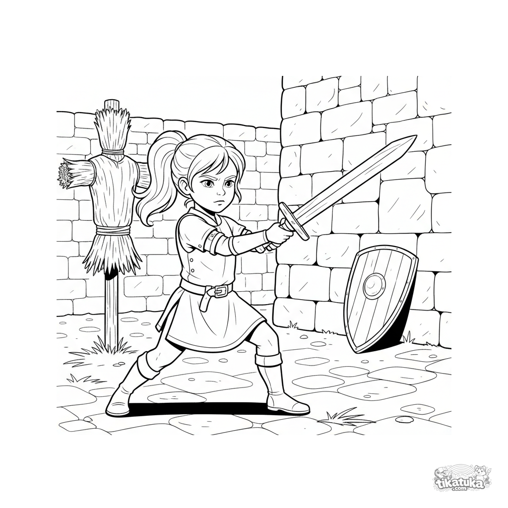 Página para colorear para niños de 4-6 años: una joven princesa guerrera con armadura de cuero practica con una espada de madera en un soleado patio de castillo, apuntando a un maniquí de paja.