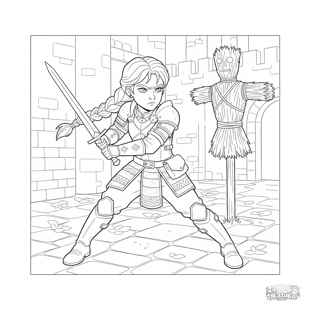 Página detallada para colorear para niños 10-12: una princesa guerrera entrena con una espada de madera en el patio de un castillo. Armadura práctica, un maniquí de entrenamiento de paja.