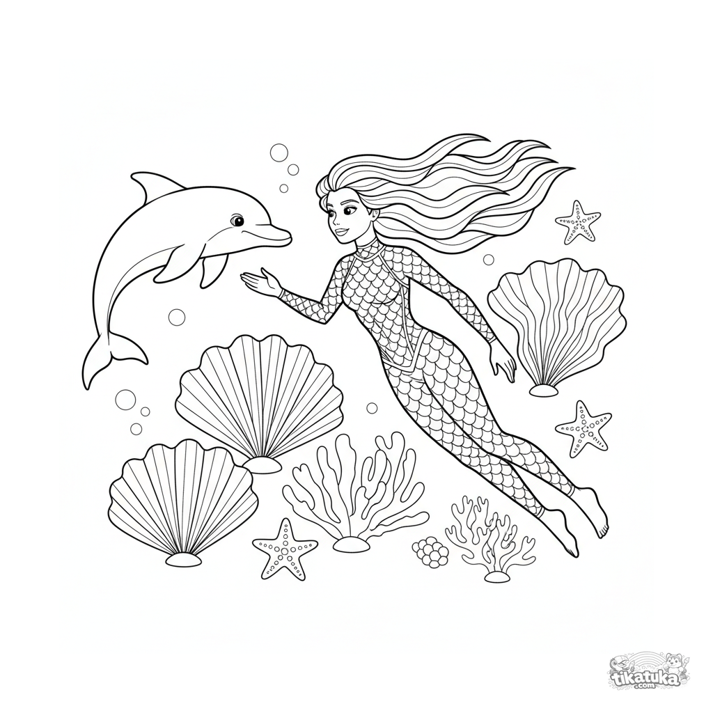 Página para colorear para 7-9 años: un superhéroe con poderes de agua explora un colorido arrecife de coral junto a un delfín amigable.