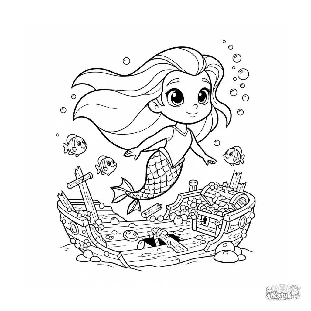 Página para colorear para niños 4-6: un superhéroe acuático en traje de escamas explora un barco hundido entre peces y tesoros. Aventura submarina.