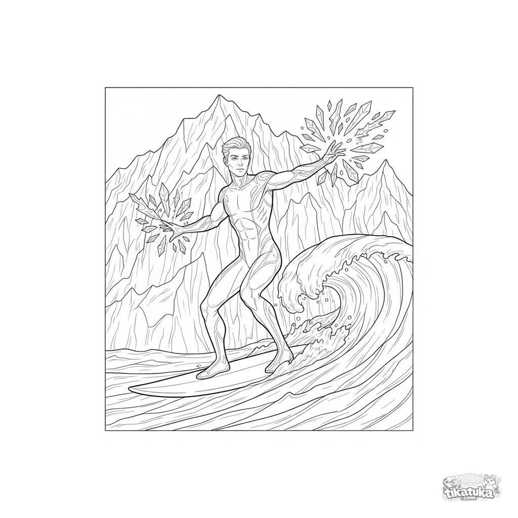Página para colorear para 10-12 años: un superhéroe de agua y hielo surfea una ola congelada junto a un glaciar ártico, creando cristales. Escena detallada estilo grabado.