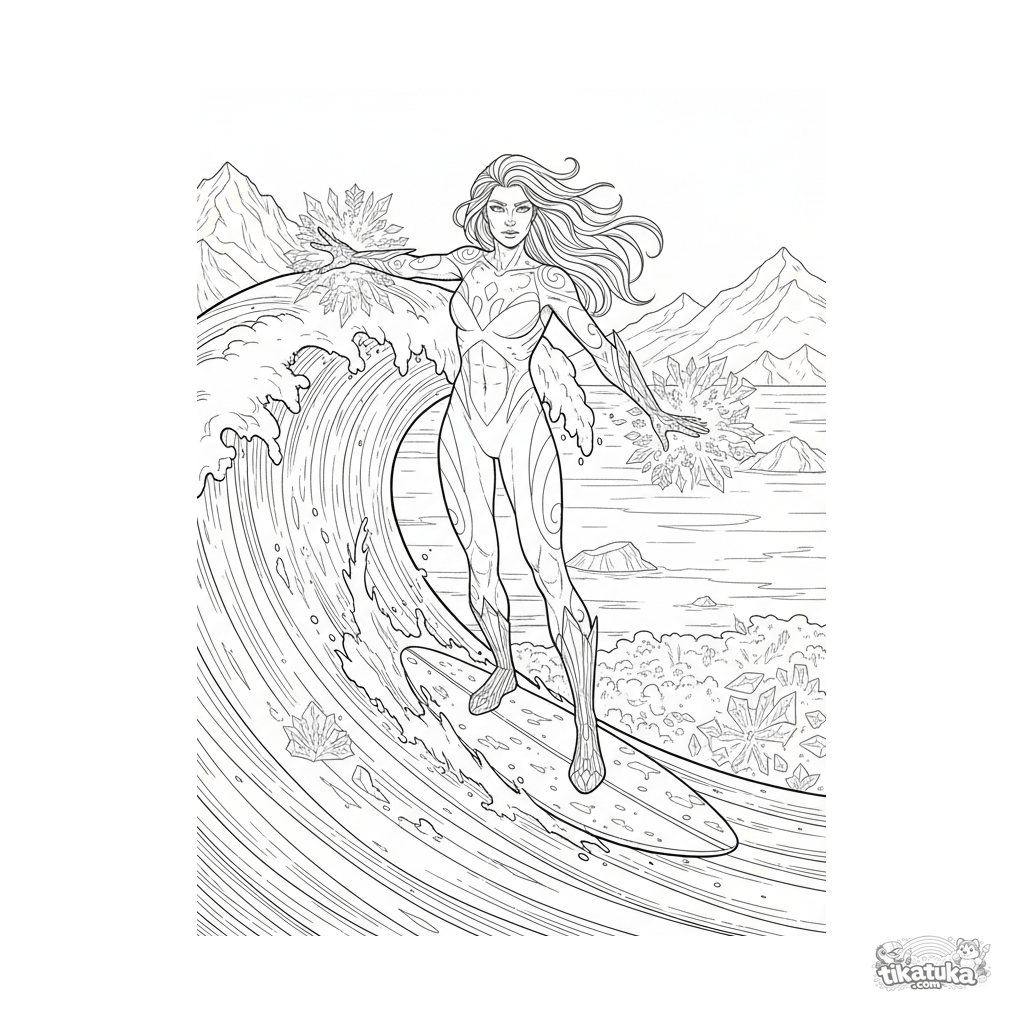 Página para colorear para niños mayores 10-12: un superhéroe con poderes de agua y hielo surfea una ola congelada en un lago helado.