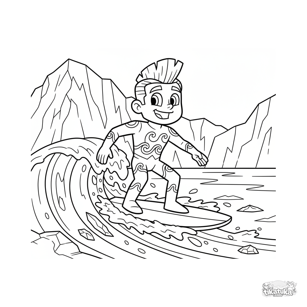 Página para colorear para niños 4-6: un héroe agua en traje azul surfea una ola helada en un lago congelado cerca de un glaciar. Escena elemental dinámica y divertida.