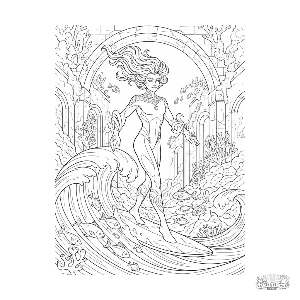 Página para colorear para 10-12 años: un superhéroe con poderes de agua cabalga una ola entre ruinas submarinas antiguas cubiertas de coral. Escena detallada con vida marina.