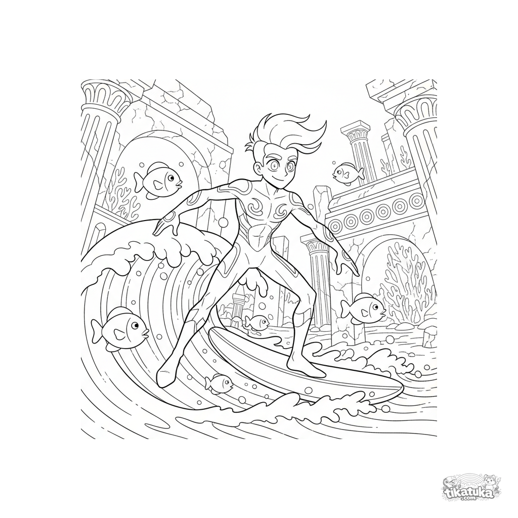 Página para colorear para mayores 10-12: un superhéroe que controla el agua surfea una ola entre los arcos de una ciudad hundida antigua.