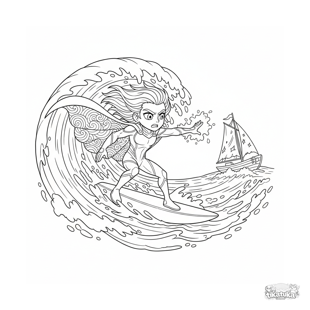 Página para colorear de un superhéroe acuático surfeando una ola para rescatar un velero. Para niños de 10 a 12 años, escena oceánica dinámica.