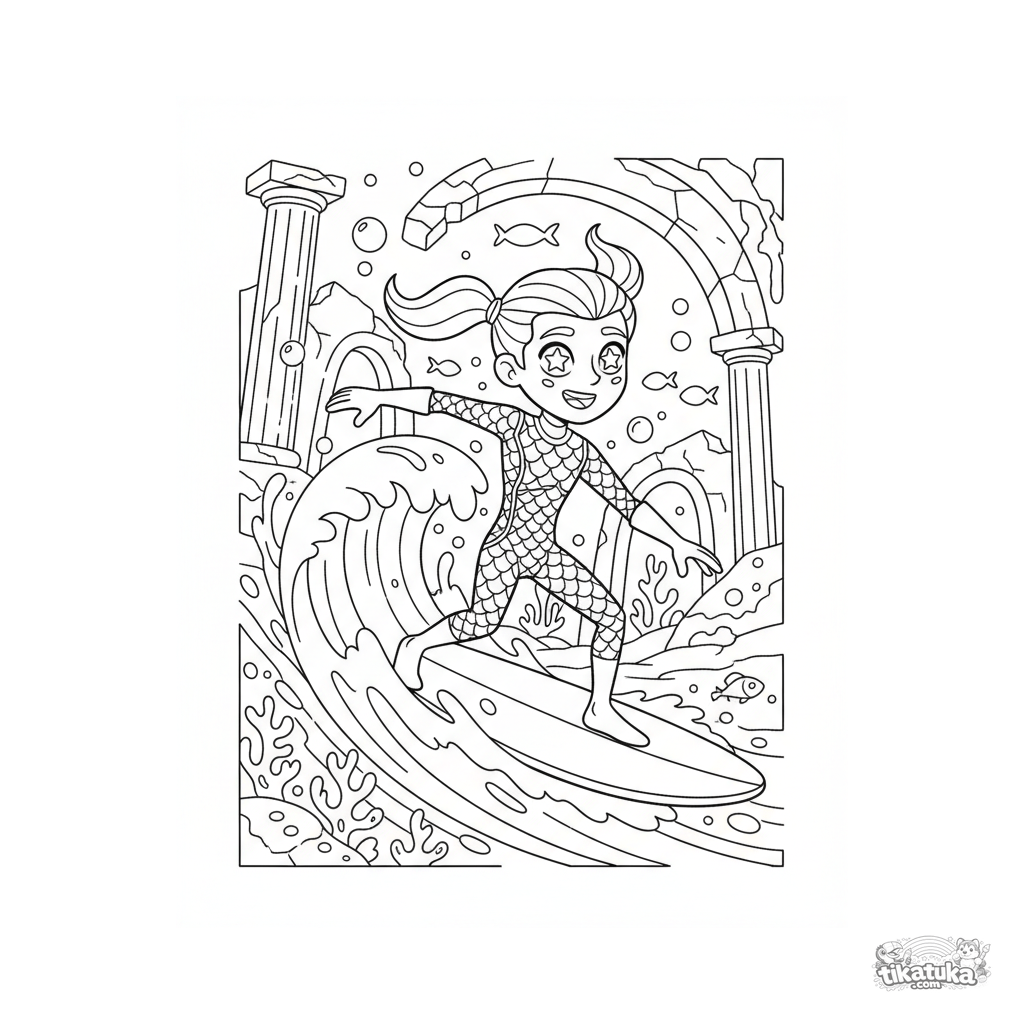 Página para colorear para niños 4-6: un superhéroe con poderes de agua surfea una ola cerca de ruinas submarinas. Escena divertida estilo dibujos 90.