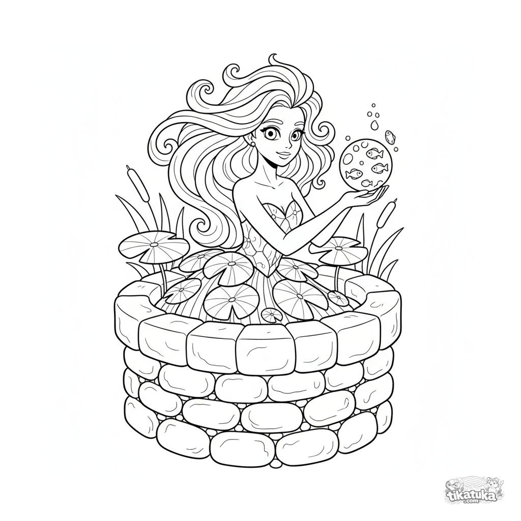 Página para colorear para niños 7-9: una náyade mágica emerge del pozo de agua viva. Estilo Art Nouveau, escena centrada.
