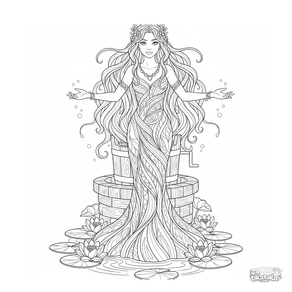 Página para colorear compleja para 10-12 años: una ninfa del agua emergiendo de un pozo de agua viva. Estilo Art Nouveau, líneas fluidas, imagen folclórica mística.