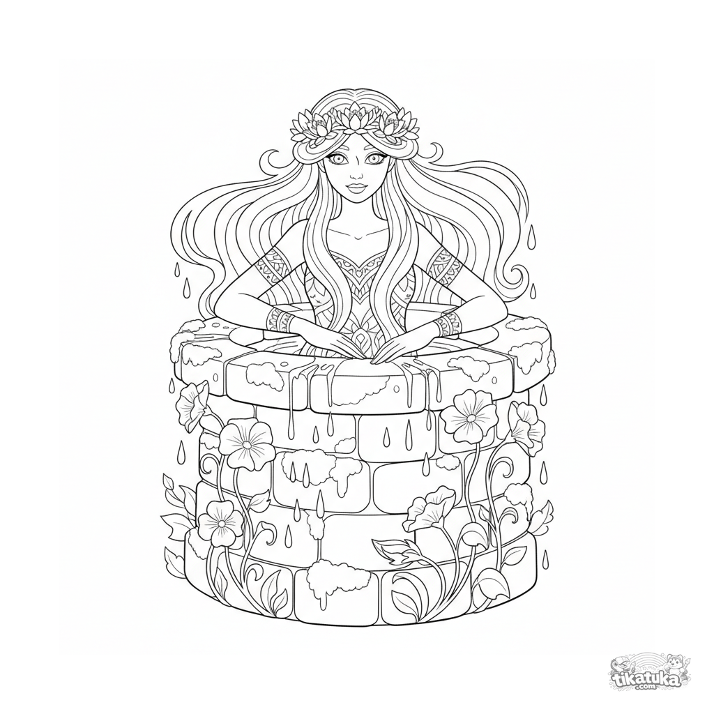 Página compleja para colorear para niños mayores 10-12: un espíritu de agua rusalka emerge del pozo de agua viva. Líneas fluidas Art Nouveau, cabello y plantas detallados.