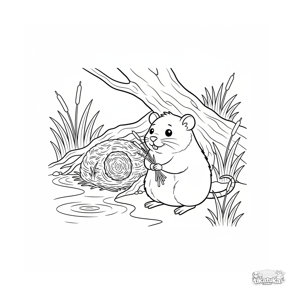 Página para colorear para niños 7-9: una decidida rata de agua construyendo activamente un nido de juncos en la orilla de un arroyo claro en otoño.