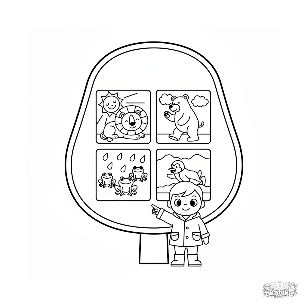 Página para colorear para niños 2-3: un panel simple del zoológico muestra símbolos del tiempo y animales activos que coinciden. Formas grandes y claras.