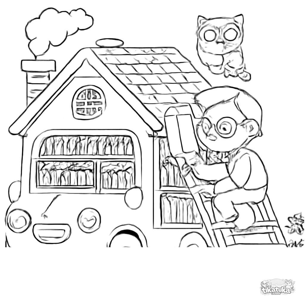 Página para colorear de un bibliobús mágico con forma de casa en un prado florido. Para niños de 6 a 9 años. Escena con bibliotecaria en escalera y búho.