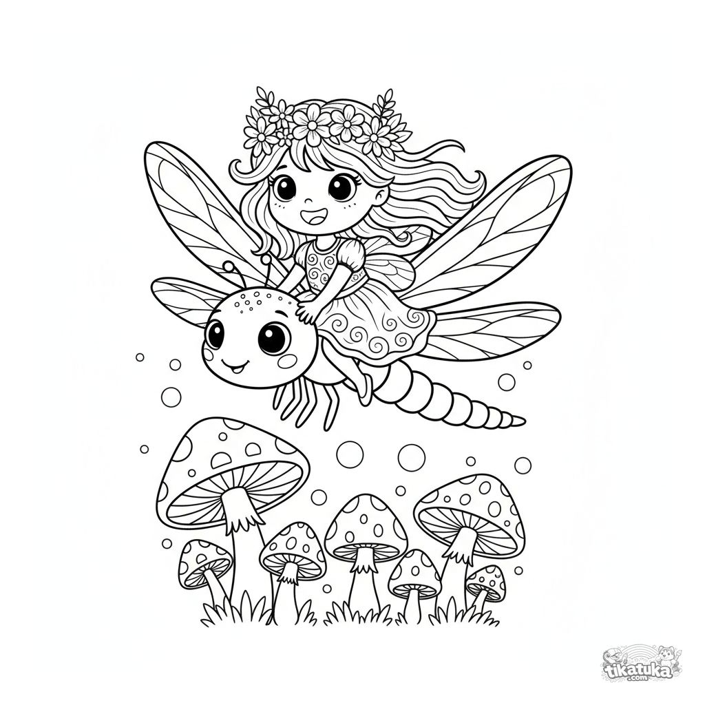 Página para colorear para niñas de 4-6 años: un hada caprichosa monta una libélula gigante sobre un bosque de setas. Fomenta la imaginación.