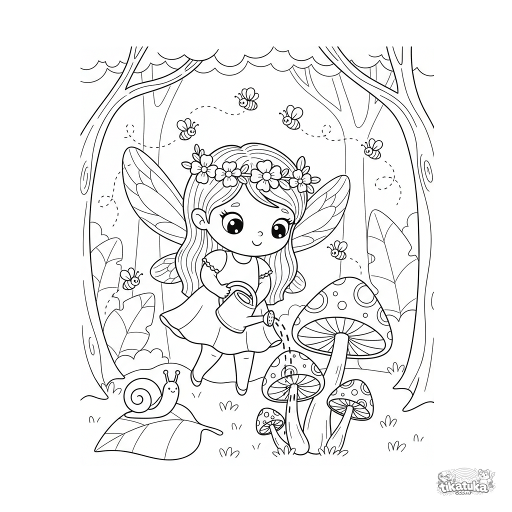 Página para colorear para niñas con una princesa hada regando hongos brillantes en un bosque encantado. Para niños de 4 a 6 años.