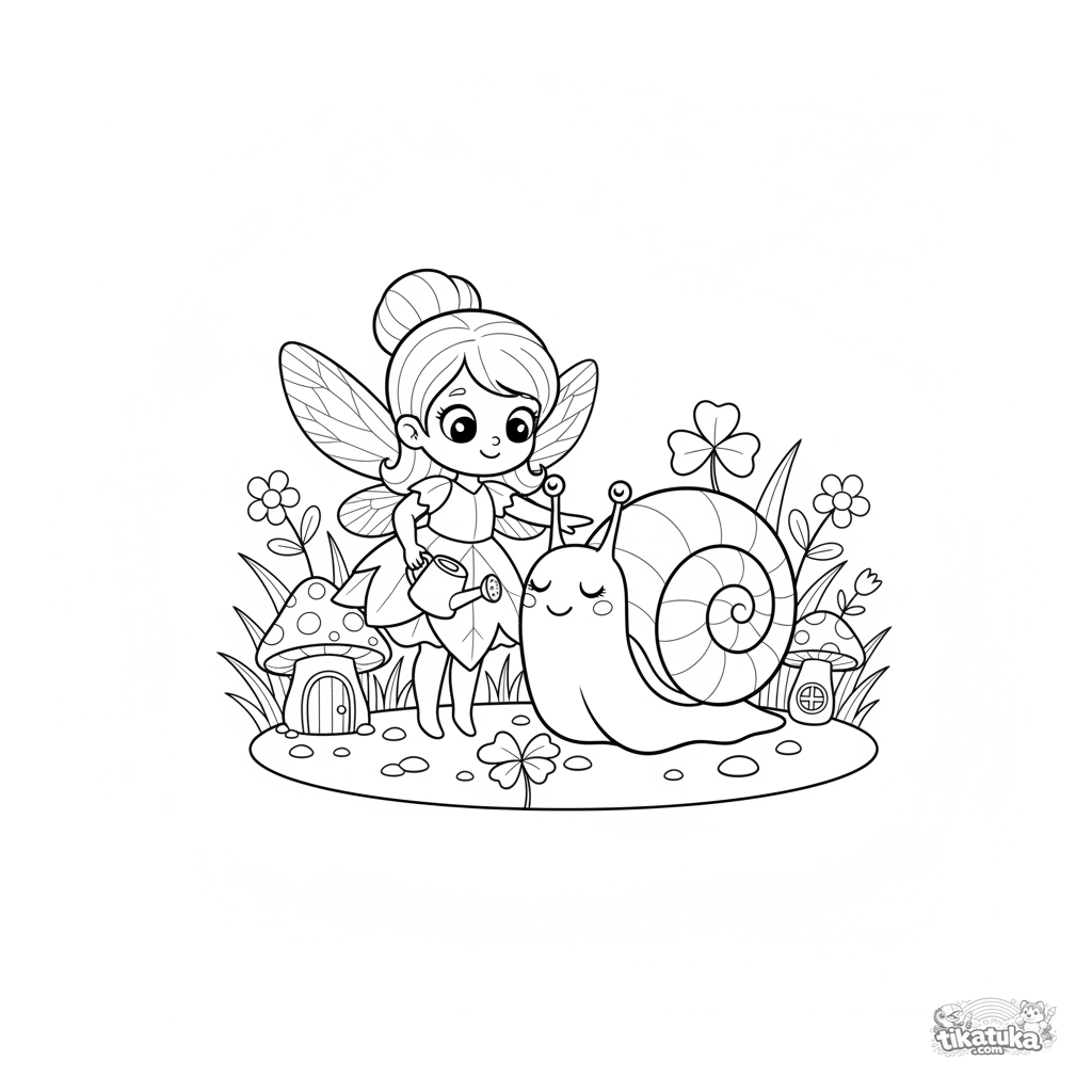 Página para colorear para niños: un hada bondadosa cuida a un caracol soñoliento cerca de una casa de hongo. Escena mágica y sencilla.