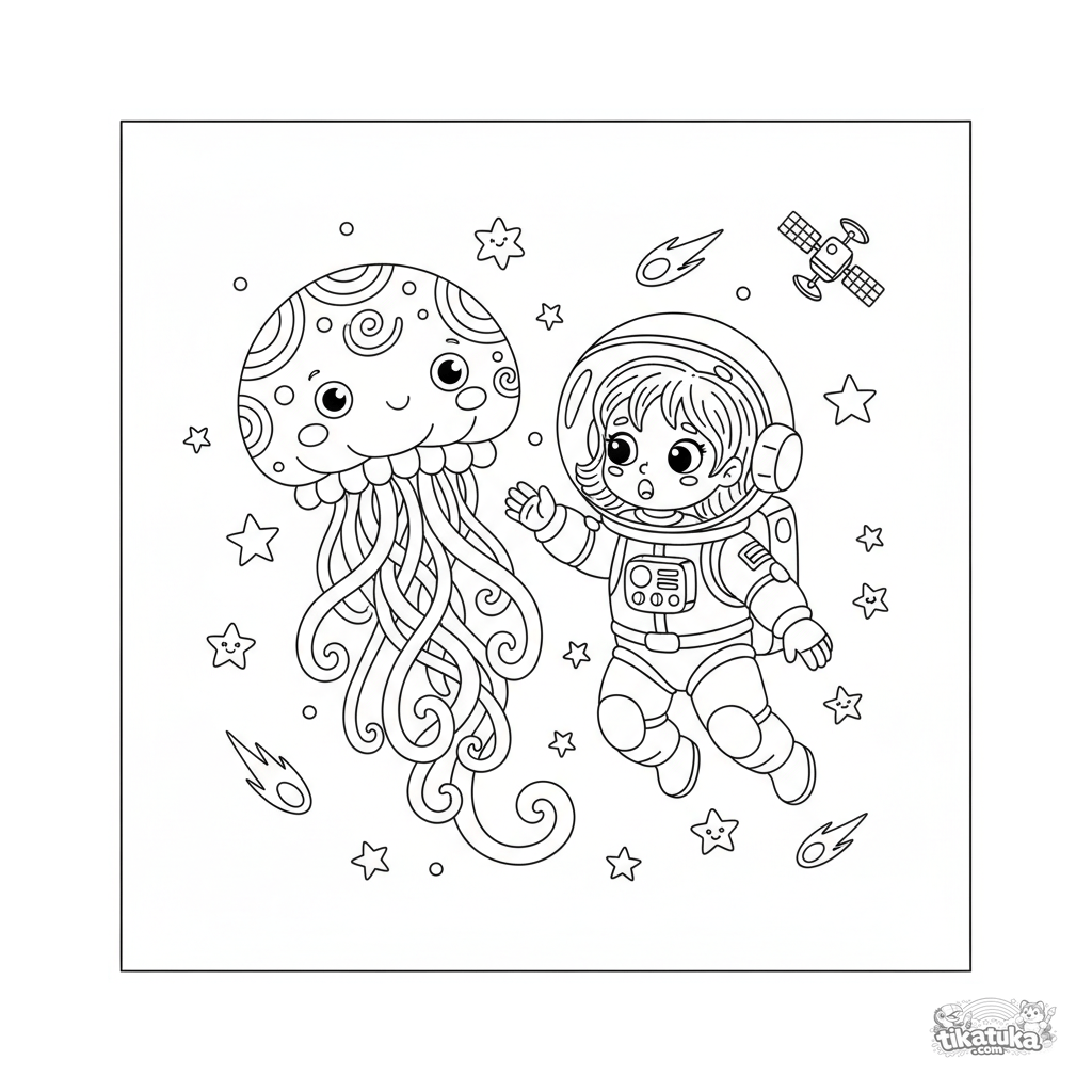 Página para colorear para niñas de 6 a 9 años: una niña astronauta encuentra una medusa gigante y amigable en el espacio exterior. Escena llena de maravillas.