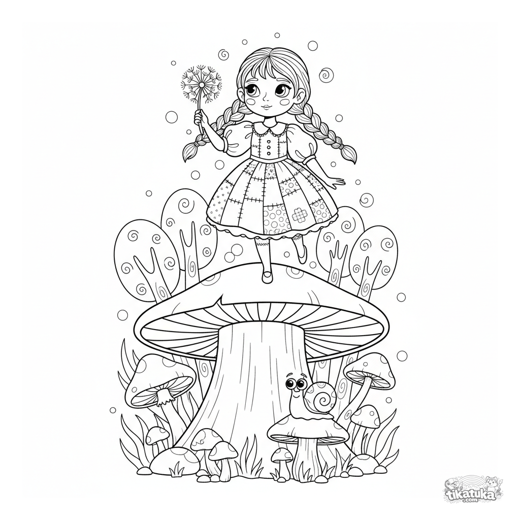 Página para colorear de una niña con vestido de retazos equilibrada en un tocón de hongo gigante en un bosque encantado. Para niños de 5-8 años.