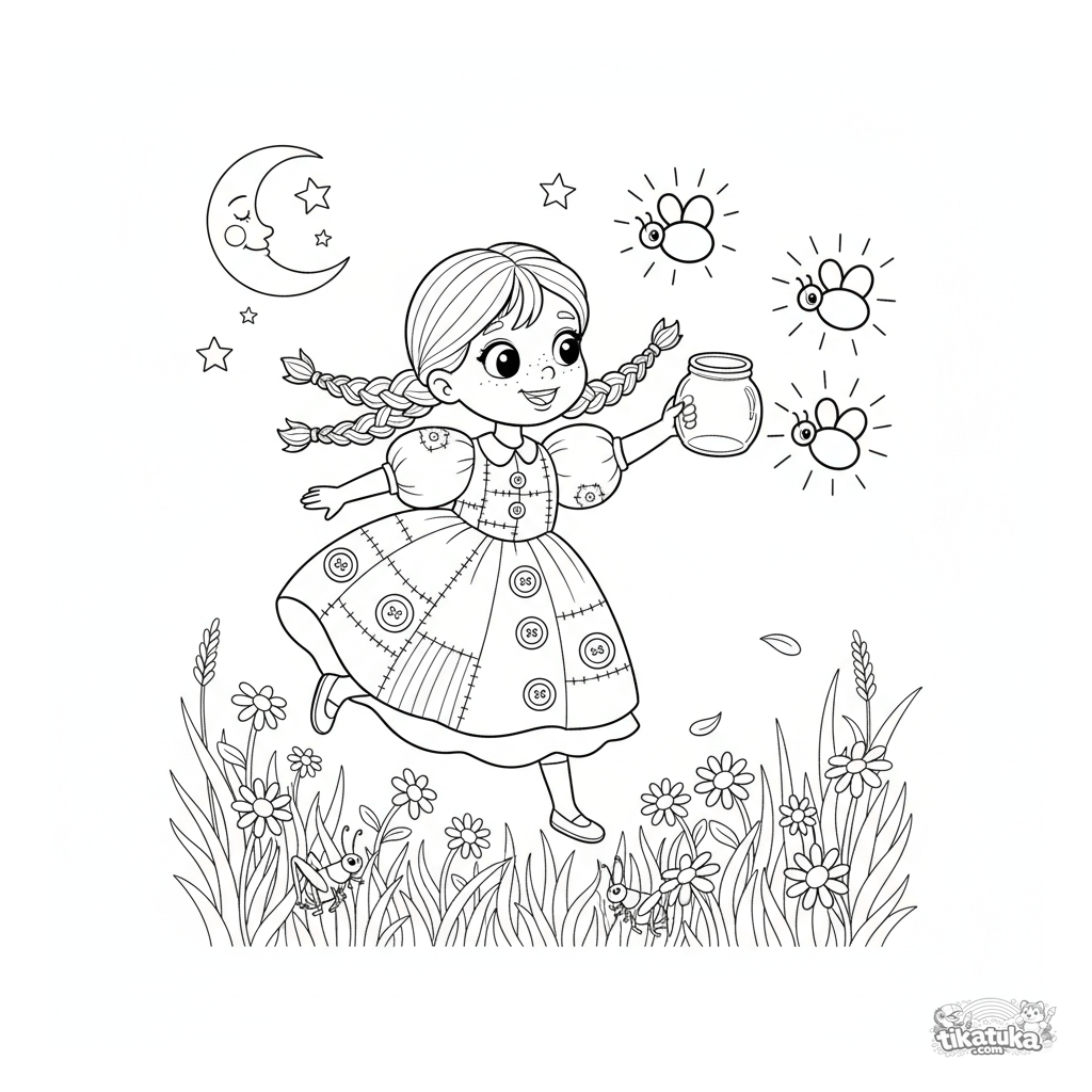 Página para colorear de una niña en vestido de retazos persiguiendo luciérnagas en un prado. Para niños de 5 a 8 años. Incluye un frasco, margaritas y una luna.