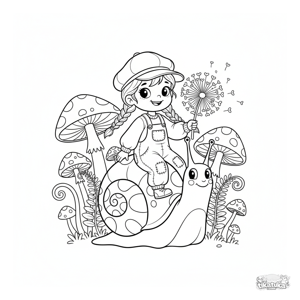 Página para colorear para niñas: una niña alegre en overol monta un caracol gigante por un bosque de hongos mágico. Para niños de 5 a 8 años.