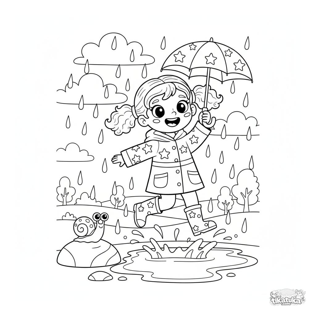 Divertida página para colorear de una niña feliz en impermeable saltando en charcos. Para niños de 3 a 6 años. Líneas simples, amplios márgenes.