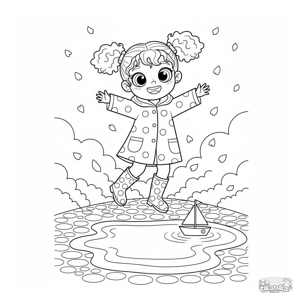 Página para colorear para niñas: una niña alegre en impermeable salta sobre un charco primaveral. Para niños de 3 a 6 años. Pétalos de cerezo flotan a su alrededor.