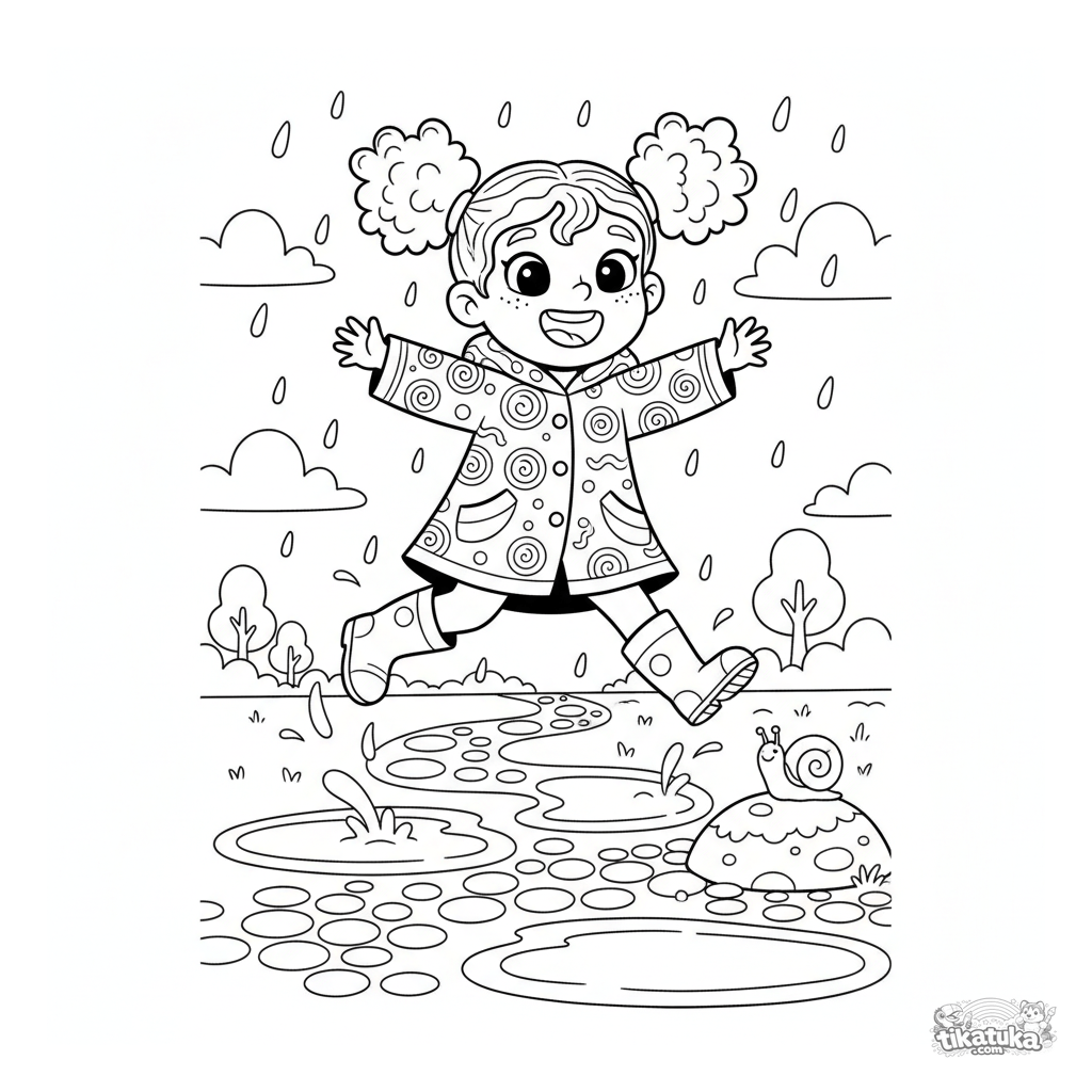 Página para colorear para niñas: una niña alegre en impermeable saltando charcos. Para niños de 5 a 8 años. La escena captura alegría y movimiento en un día lluvioso.