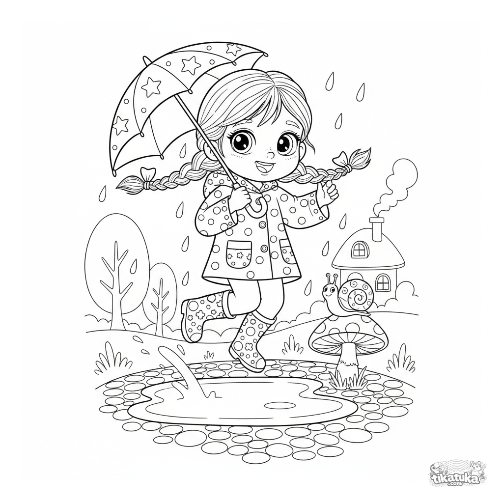Página para colorear de una niña alegre en impermeable saltando charcos. Para niños de 4 a 7 años. Tiene un paraguas con estrellas, un caracol en un hongo cerca.