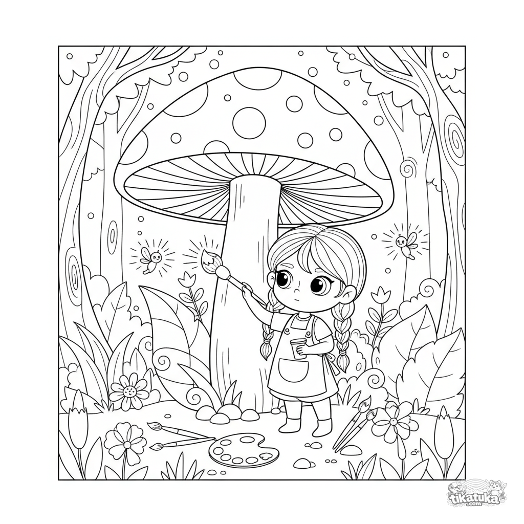 Página para colorear de una niña pintando un hongo gigante en un bosque encantado. Para niños de 5 a 8 años. Escena mágica con detalles imaginativos.