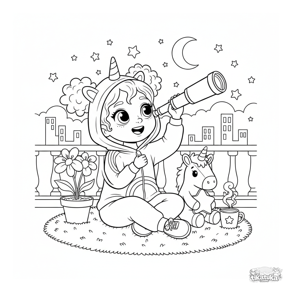 Página para colorear para niñas: una niña en pijama de unicornio con un telescopio en un balcón nocturno. Para niños de 5 a 8 años. Incluye un peluche de unicornio, almohada estrella y una flor nocturna.