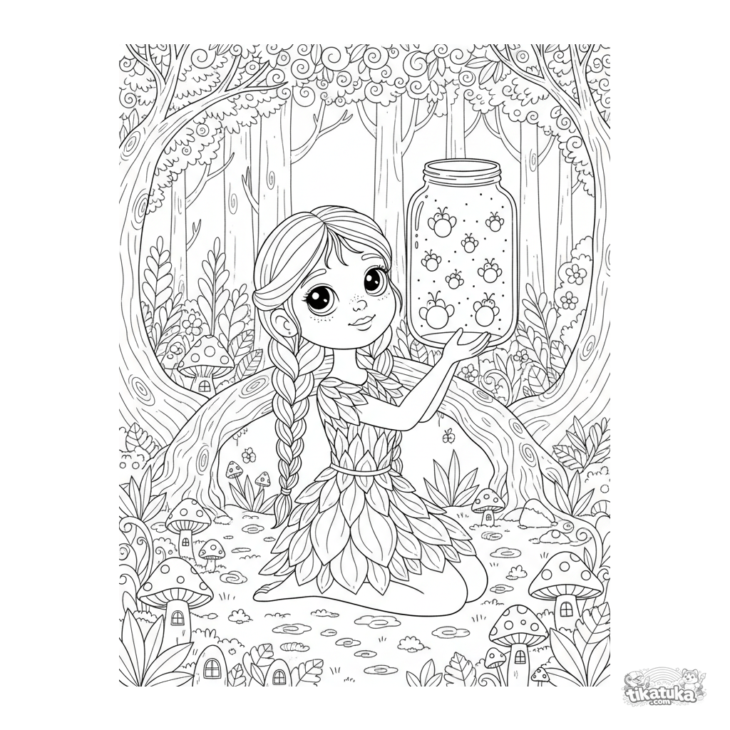 Página para colorear de una niña en un bosque encantado. Para niños de 6 a 9 años. La niña con vestido de hojas sostiene un tarro de luciérnagas.